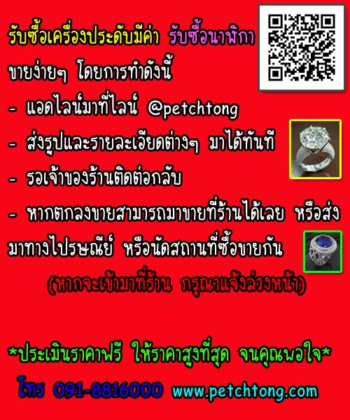 ร้านรับซื้อทองคำ ทองk ทองทุกเปอร์เซ็นต์ ทองเมืองนอก ทองอิตาลี ทองทุกสภาพ ให้ราคาสูง รับซื้อเพชร รับซื้อตั๋วจำนำ รับซื้อเครื่องประดับ ของมีค่า ร้านเปิดทุกวัน ประเมินราคาให้ก่อนฟรี รับซื้อถึงบ้าน ส่งรูปมาทางไลน์ได้ตลอดเวลา โทรศัพท์ 091-8816000, 089-9238456 คุณ ลัก Line id : @petchtong สแกน QR Code https://line.me/R/ti/p/%40petchtong